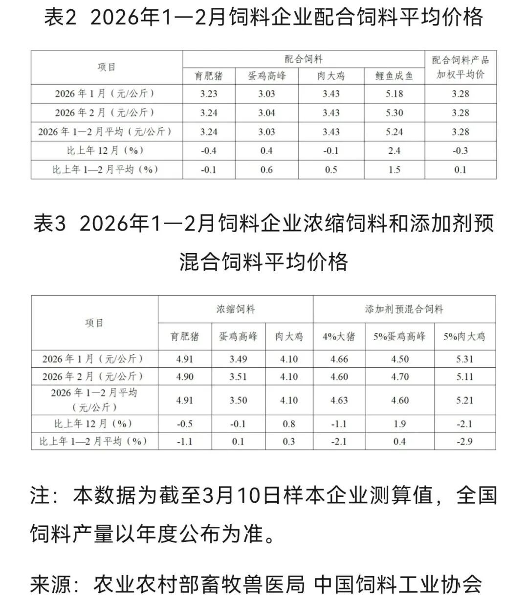 配合饲料:2026年1-2月加权平均价格为3.28元/公斤,与去年12月相比略降0.3%。细分品类中,育肥猪、肉大鸡配合饲料价格微降,蛋鸡高峰、鲤鱼成鱼配合饲料价格微涨。