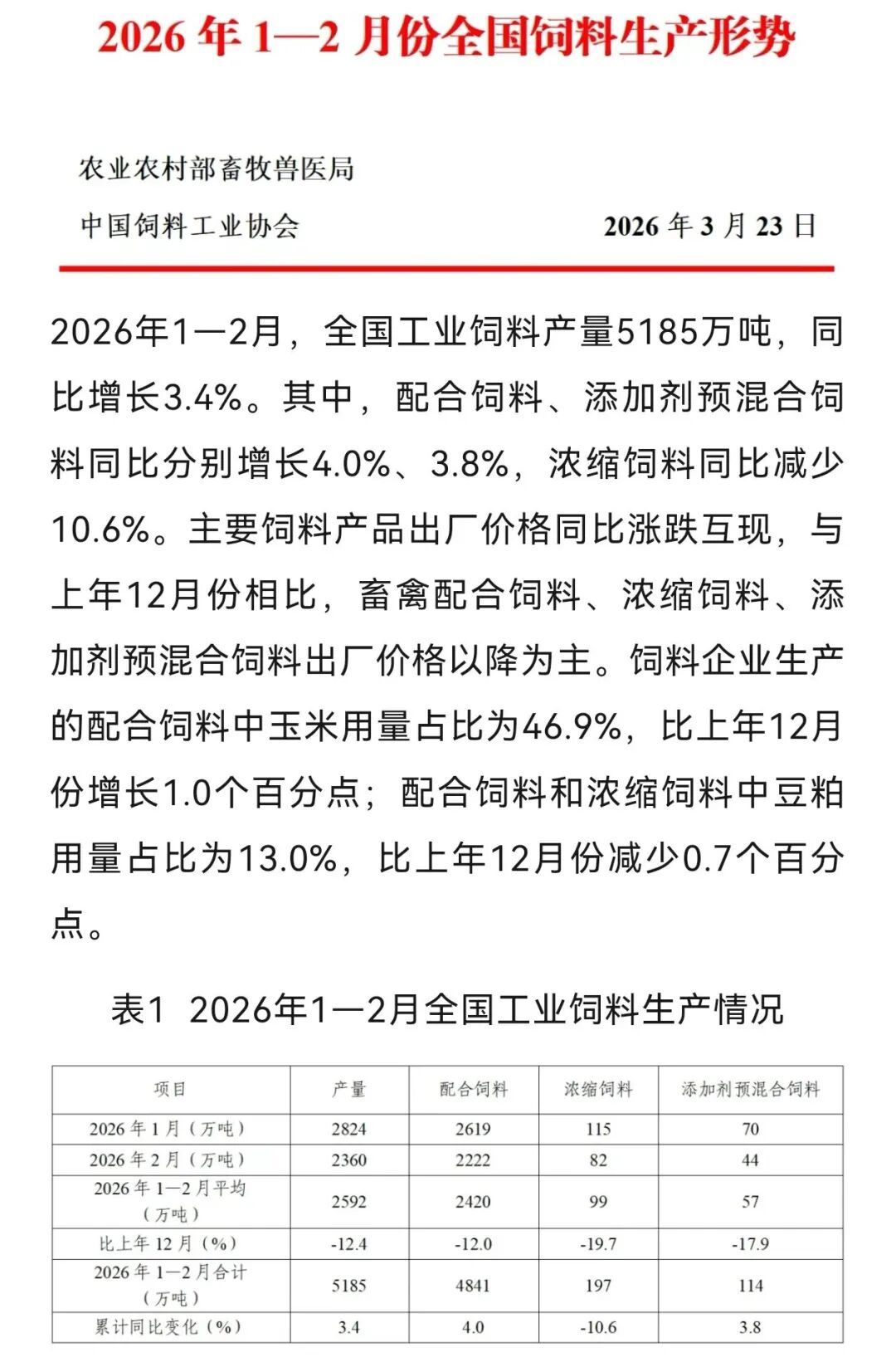 总产量:2026年1-2月,全国工业饲料总产量为5185万吨,同比增长3.4%。